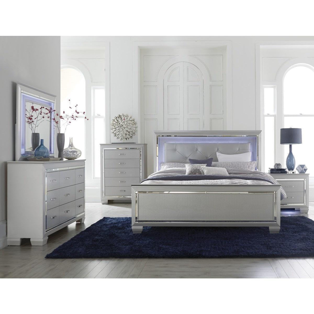 Glamour reigns in the design of the Allura Collection. Framing the Full bed is a decorative beveled mirror accent that enhances the illumination from the touch-engaged LED backlight of the headboard and mirror, as well as the under-light of the night stand. The silver faux leather crystal-tufted headboard insert boldly accents the silver finish.