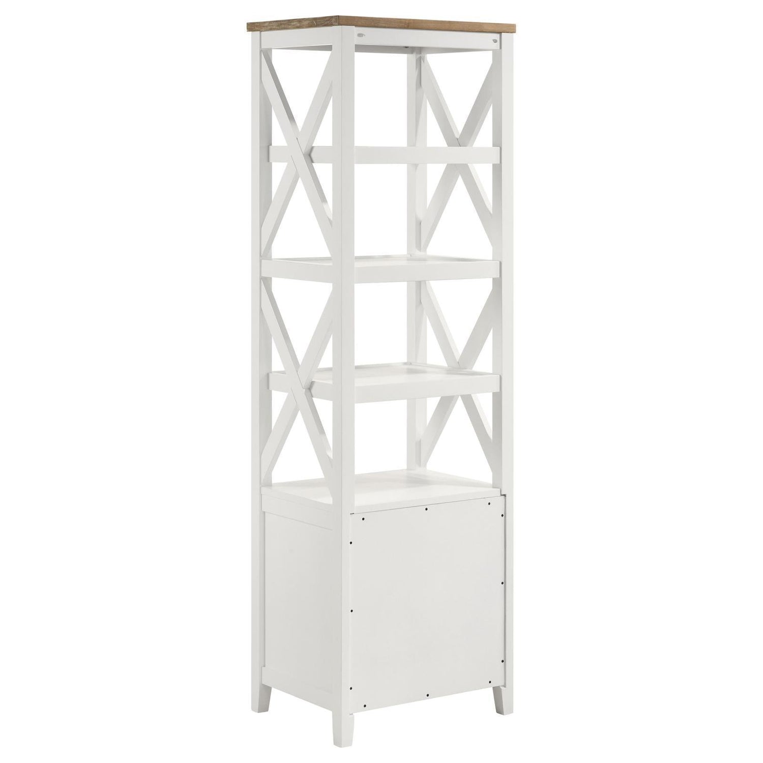 Spacious or compact, a casual living space has storage needs, and this wood media tower is a solid choice. Organize books and implements neatly while adding a fresh, inspiring look to a living room or family room. This modern tower is a mix of cottage-style, coastal, and rustic farmhouse, offering a superbly versatile fit. White finish wood construction features a four-shelf open bookcase above a two-drawer storage unit with full-drawer extension glides, as an eye-catching geometric look places X-shape elements on each side of its open bookcase. A brown finish ash veneer top changes up the style to add even more design flexibility.