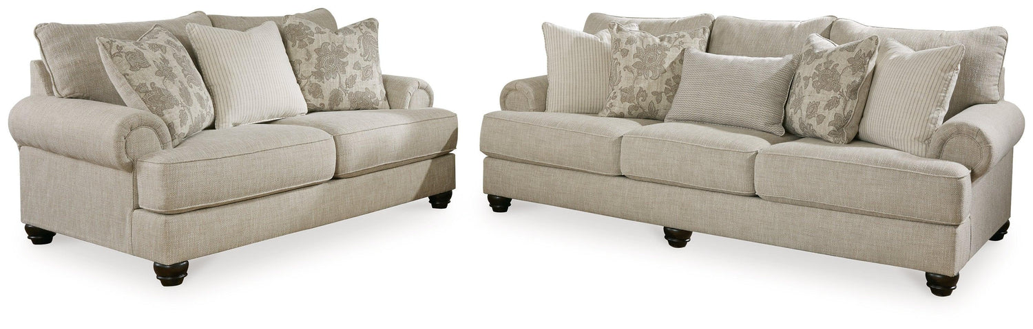 This sofa and loveseat package has an alluring look that's guaranteed to turn heads. Richly textured fabric in a light, easygoing hue is enhanced by even lighter flax peeking through. Distinctive roll arms add a dab of debonair, while indulgently plush cushions cradle you softly. Sit back and relax in comfort and style, with plenty of room to stretch out and unwind at the end of a long day.