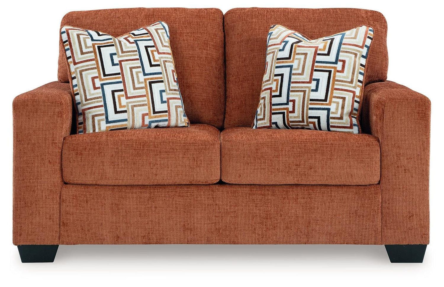 Looking to make a bold statement with color? Liven up your living room with this loveseat. Its trend-right burnt orange upholstery adds a playful pop of color to your decor. Bold and eclectic accent pillows complete the look. Pairing posh style with everyday comfort, this piece is a welcome addition to contemporary spaces.