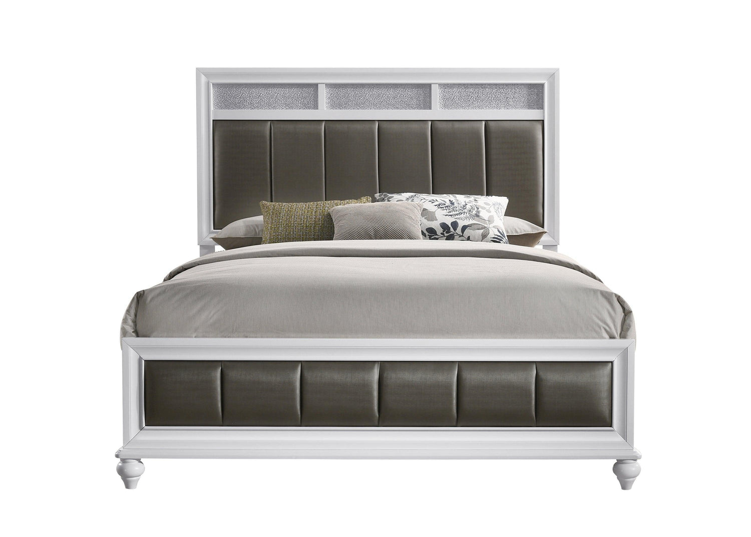 Perfectly suited for more transitional bedrooms, this panel bed features a tall panel headboard and footboard. With a white finished frame throughout, this bed offers extra touches such as channel tufted paneling wrapped in a metallic leatherette upholstery and sparkling accents. The white frame also features molding accents a well as turned feet on the footboard. Place this bed in a primary suite to lend a more glamorous vibe. This bed frame is available in several sizes as well.