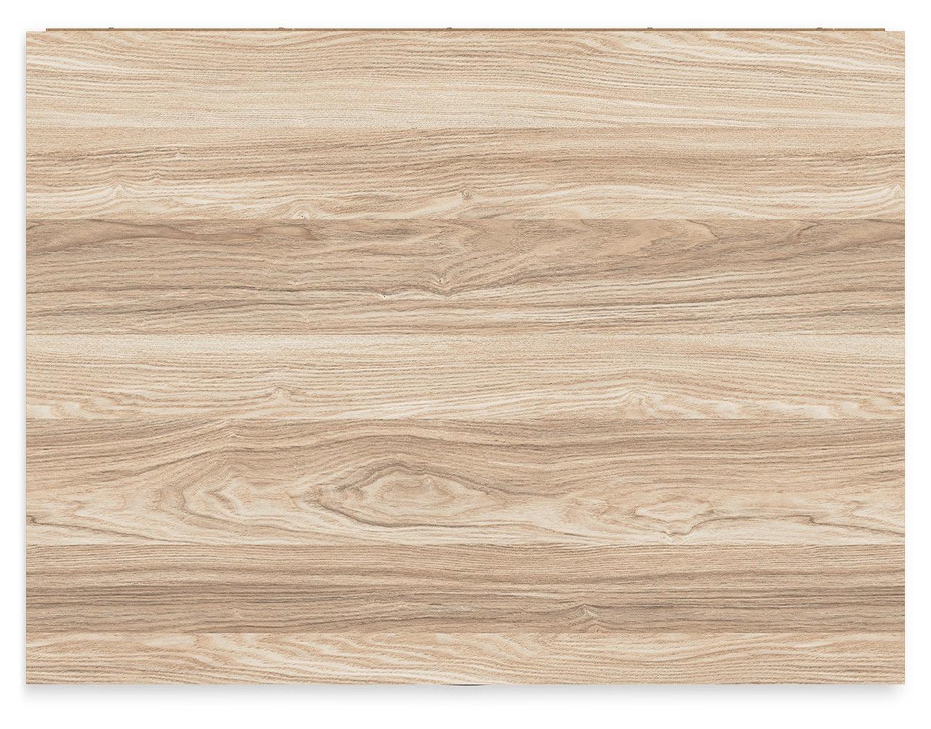 Two-tone finish (dry, light finish over replicated oak grain; light chevron pattern)