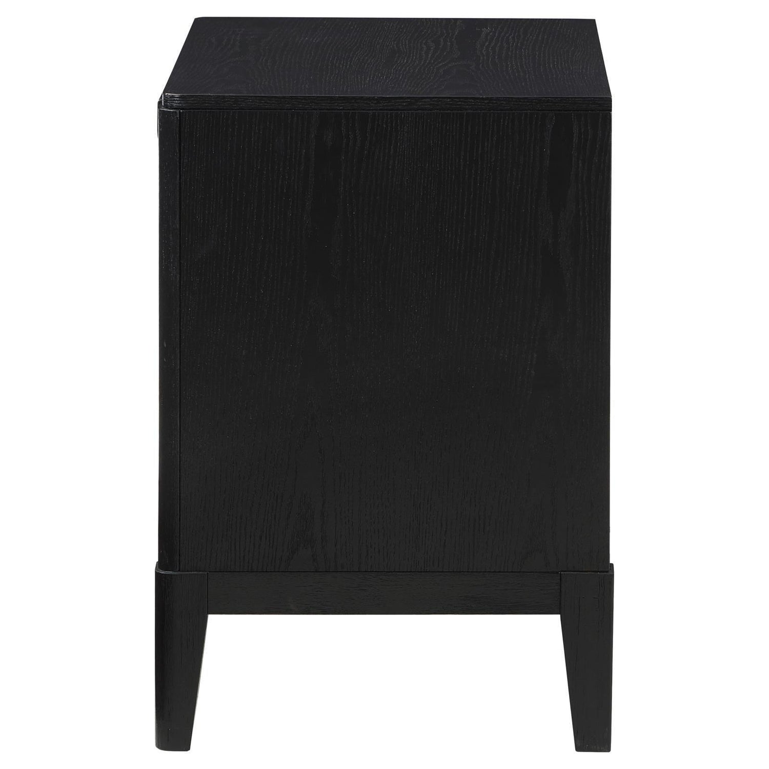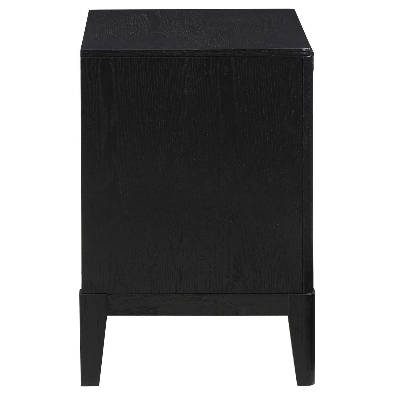 Augment your sophisticated bedroom with the addition of a modern two-drawer nightstand. It boasts a classic stance, with two drawers that offer a place for overnight essentials and personal necessities like books. The top drawer includes felt lining while half-moon pulls add metallic contrast with a soft golden hue. Drawer fronts are fluted, offering impressive texture and dimensionality at your bedside. Its black finish is wire brushed, adding the perfect touch of texture and depth.