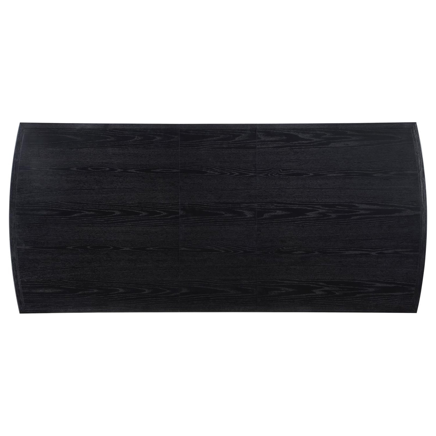 Consider a new approach to interior décor with a wood dining table playing up minimalist style with subtle, sleek curves and a linear silhouette. Your modern environment craves a more low-key aesthetic with just enough fashion sense, and this dining table delivers. A basic clean design embellished with a symmetrical sculpted edge on its tabletop and straight, wide legs converge with ease. Black finish wood construction with wire brushed distressing is sturdy and bold, with a level of functional versatility. Extend the tabletop to accommodate more guests by using a removable extension leaf included to make this table an all-around superb choice.