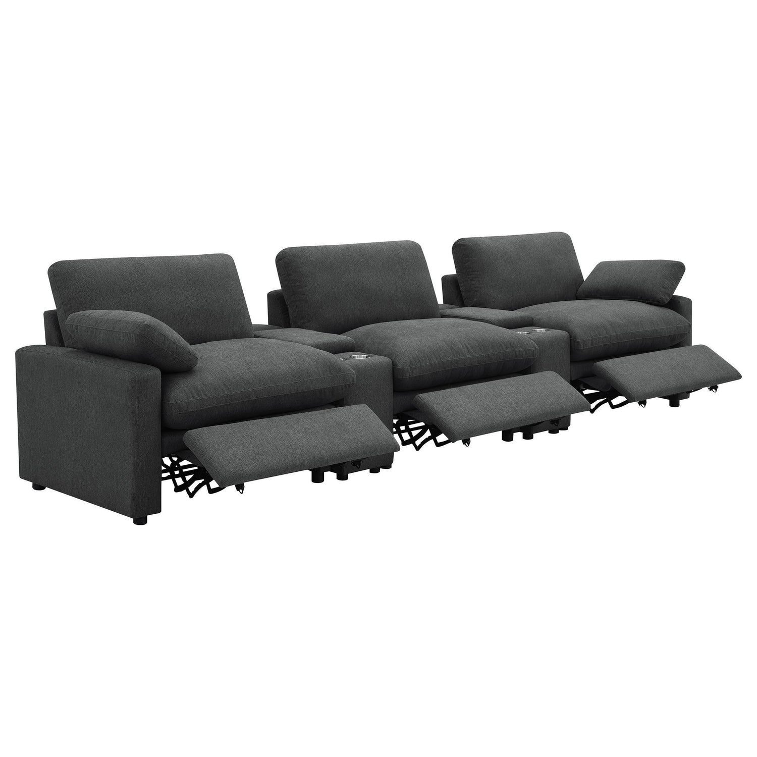 This three-seat home theater seating set combines modern convenience with plush comfort. Each power recliner offers smooth adjustability, while two center consoles feature lift-top storage and dual stainless steel cup holders. Upholstered in soft fabric, the generously padded cushions and pillow-top armrests enhance relaxation. Built for durability and long-lasting support, this seating arrangement is perfect for creating a cozy entertainment space.