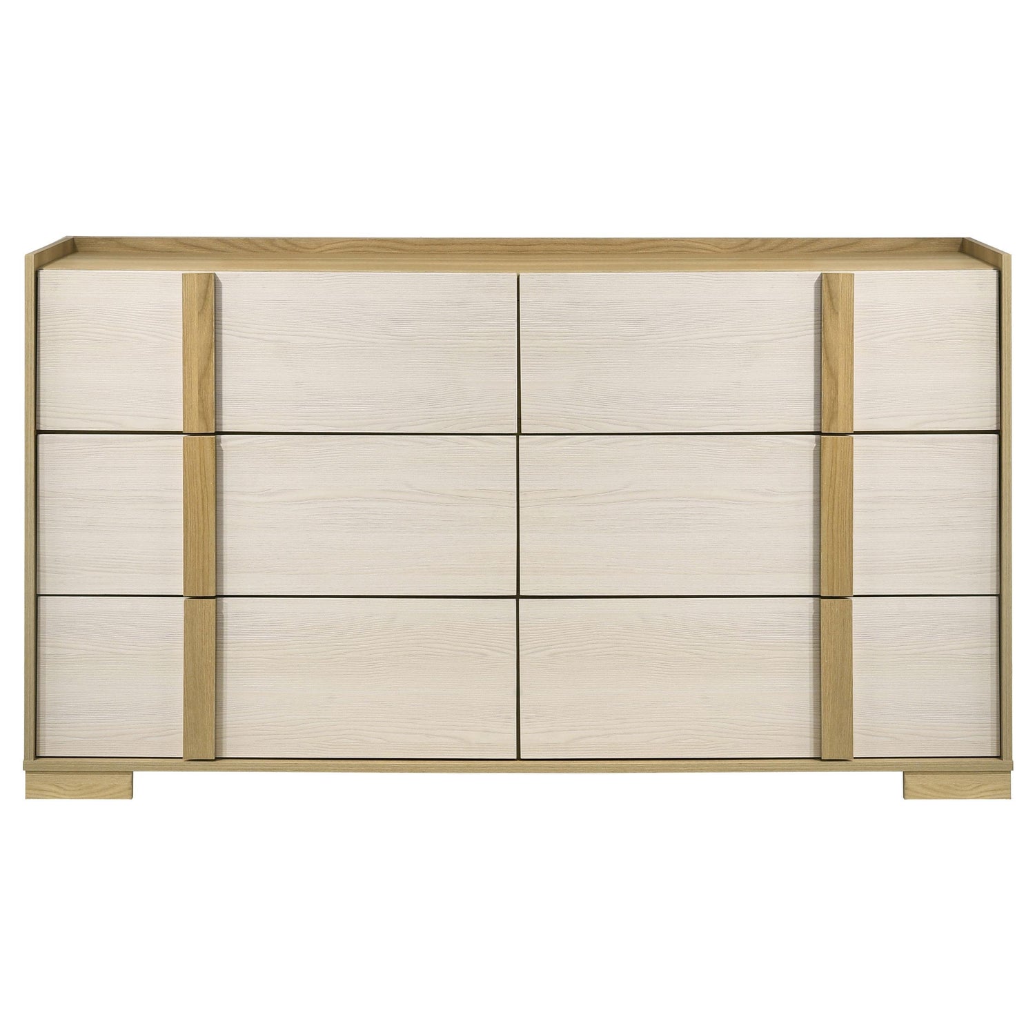 Enhance your bedroom with the contemporary elegance of this six-drawer dresser. Inspired by modern Italian design, it features a sophisticated blend of natural wood tones and white panels crafted from durable, easy-care melamine. The drawers, equipped with metal extension glides and pin-construction joinery, offer smooth operation and ample storage for your clothing and accessories. The vertical lines of the natural finish hardware add a touch of sleek sophistication, perfectly complementing the dresser's clean lines and modern aesthetic. This dresser is not just a storage solution but a stylish focal point that elevates your home decor.