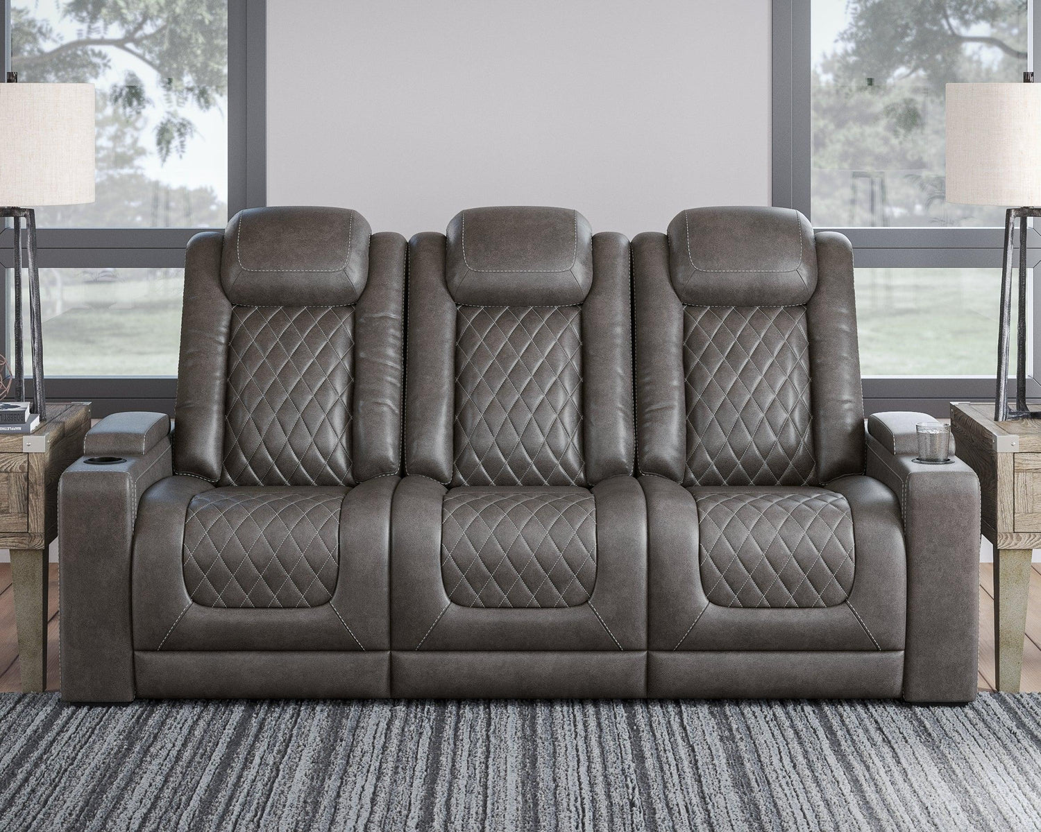 Sofa features drop-down center table with 2 cup holders, flip-up light and hidden AC power and USB ports