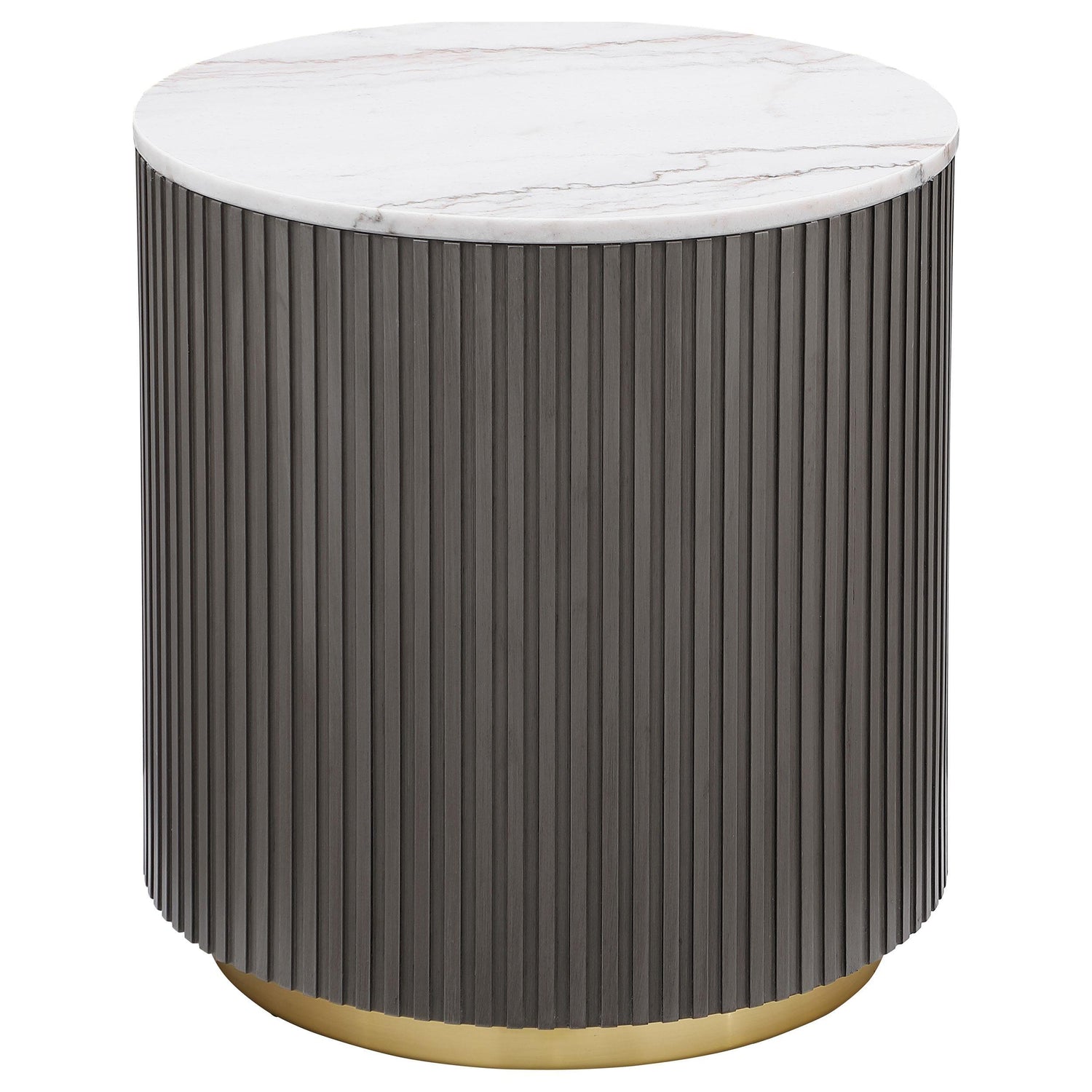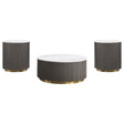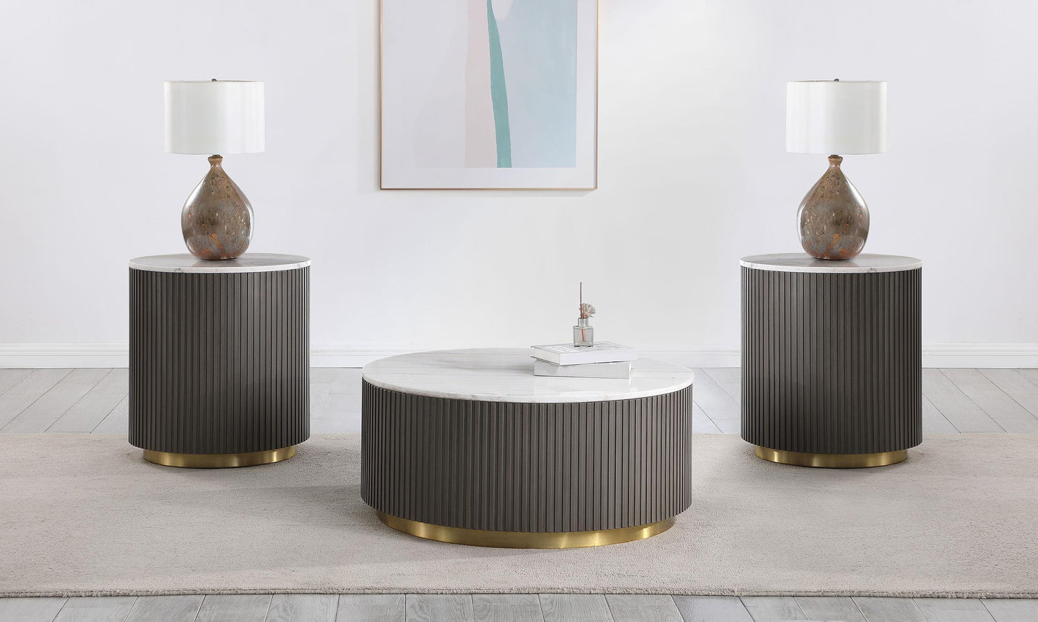 This elegant coffee table set features a modern round coffee table and end table with a genuine white marble tops. The engineered wood frame in a charcoal finish is accented by ribbed detailing, offering a textured and contemporary look. Each table sits on a brushed gold metal base that adds a touch of luxury. The set's refined materials and sleek design make it a perfect addition to any living room, creating a balanced atmosphere of sophistication and style.