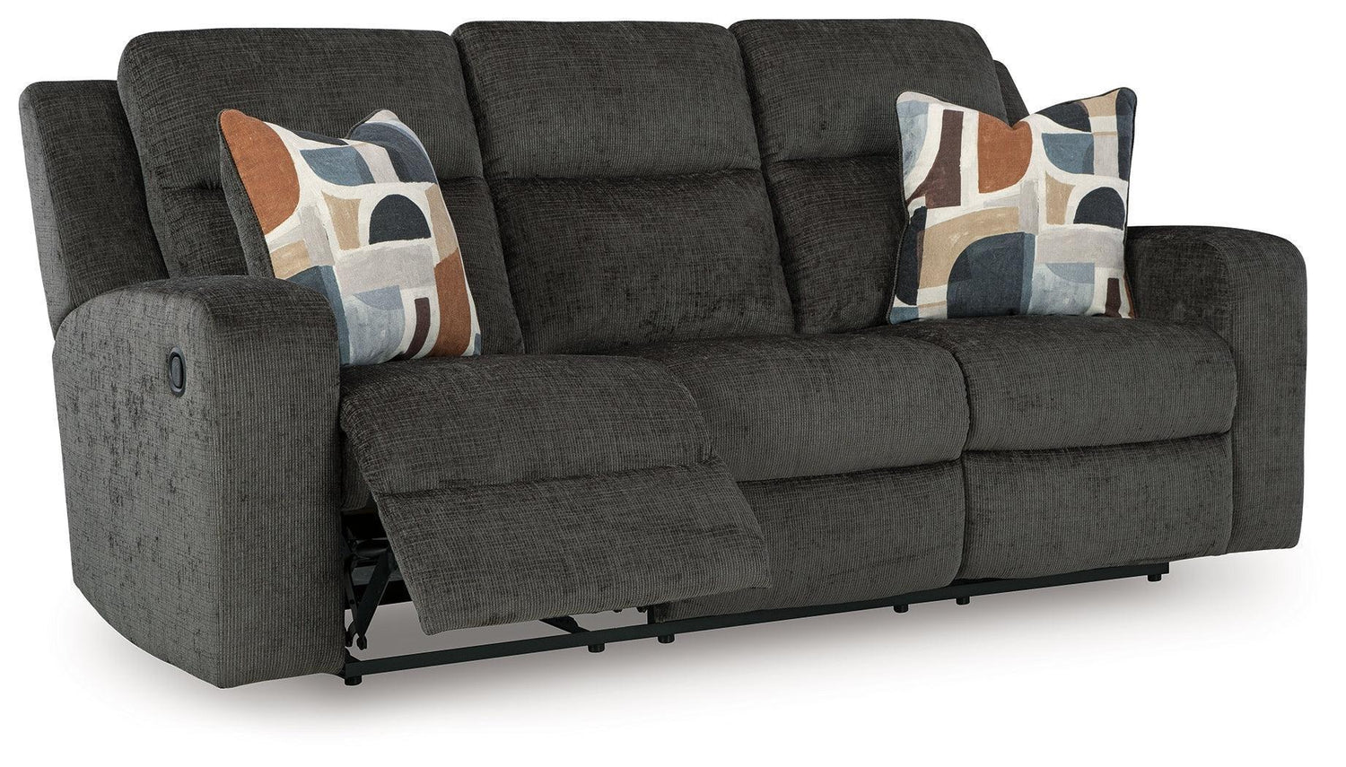 Indulgent comfort meets fashion-forward flair in this reclining sofa. Its luxuriously soft upholstery and captivating color show off your cozy yet smart style. Sleek track arms infuse a modern sensibility, while the striking accent pillows make this piece even more inviting. Simple pull tab reclining puts endless relaxation within easy reach, whether you're lounging solo or with friends.