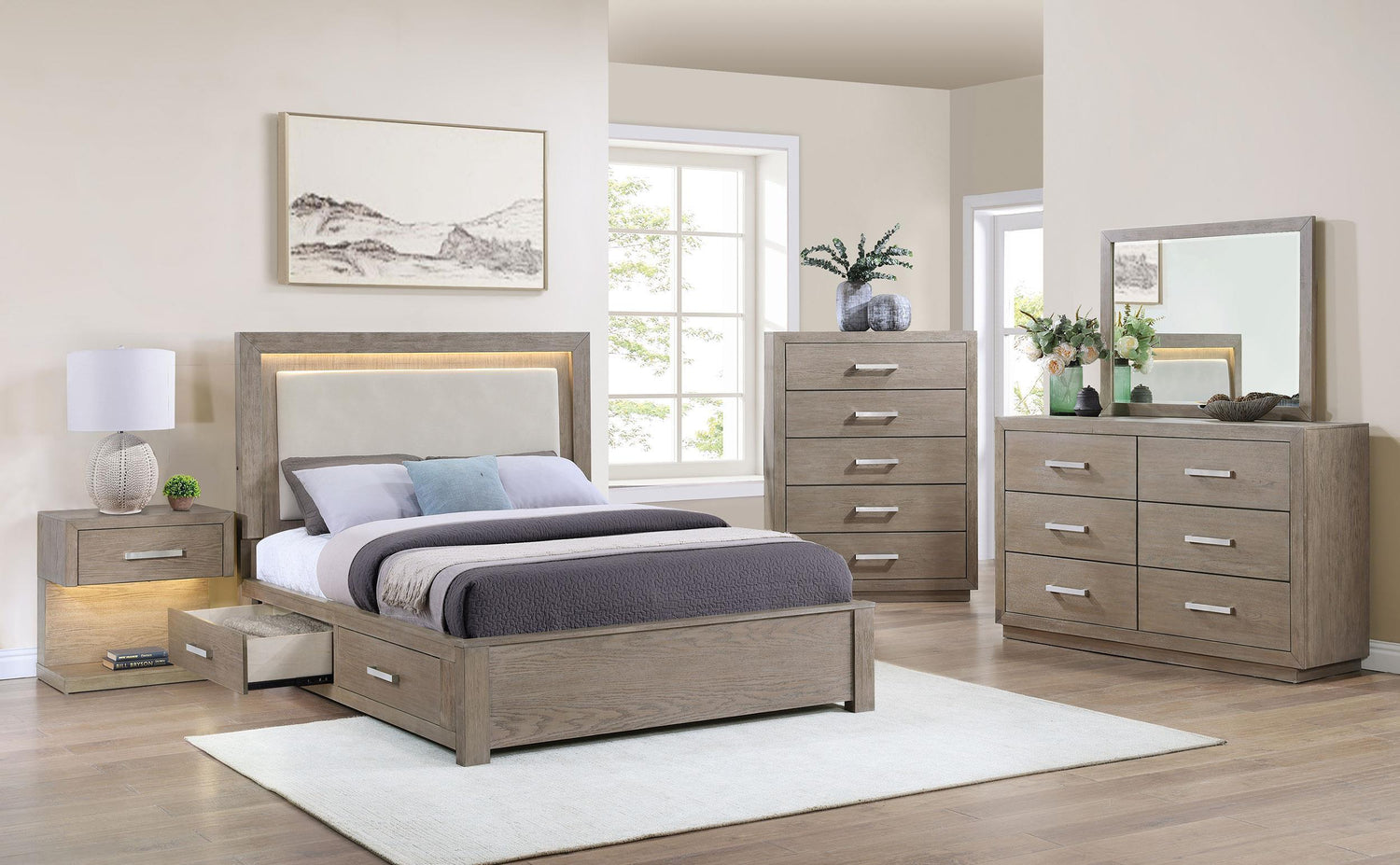 Make the most of every inch in your stylish bedroom with a modern four-drawer wooden bed that includes an upholstered headboard with LED lighting for easy ambiance. The bed boasts a barley brown finish over wood grain details, creating a soft, neutral palette with organic flair. Four drawers are tucked underneath platform slats, creating ample storage that's perfect for everything from clothing and linens to personal items. The bed is defined with a squared headboard that features an upholstered panel with foam cushioning and beige upholstery, perfect for lounging with a book or movie. Built-in LED lighting is a perfect complement, adding soft, inviting ambiance in your bedroom.