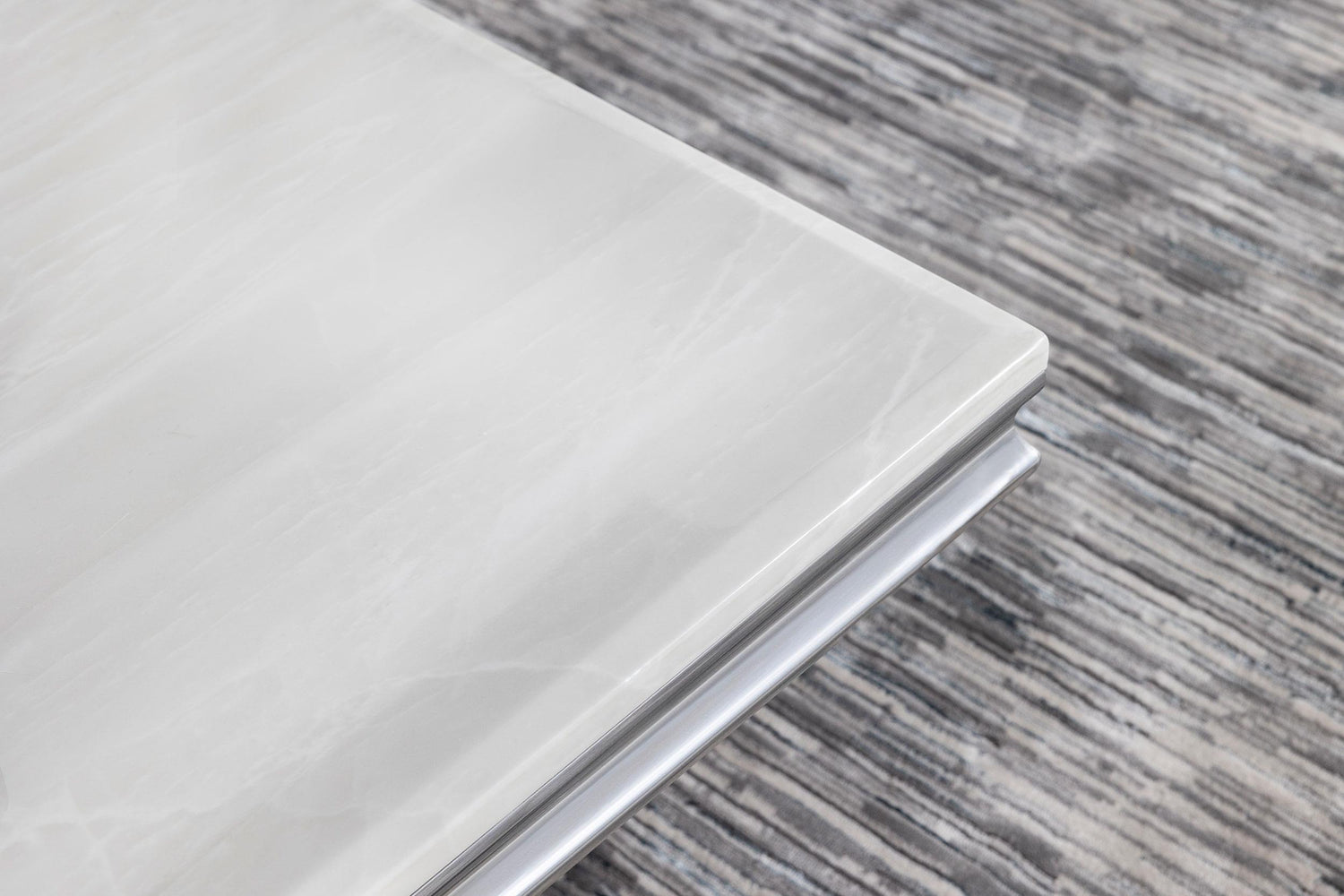 This coffee table set exudes modern glam with sintered stone tops, featuring a marble-like appearance and beveled edges for a luxurious touch. Sweeping demilune pedestal bases, crafted from polished stainless steel, offer sculptural elegance and lasting stability. The contoured molding enhances the sleek, contemporary aesthetic, making this ultra-modern set a timeless and practical addition to refined interiors.