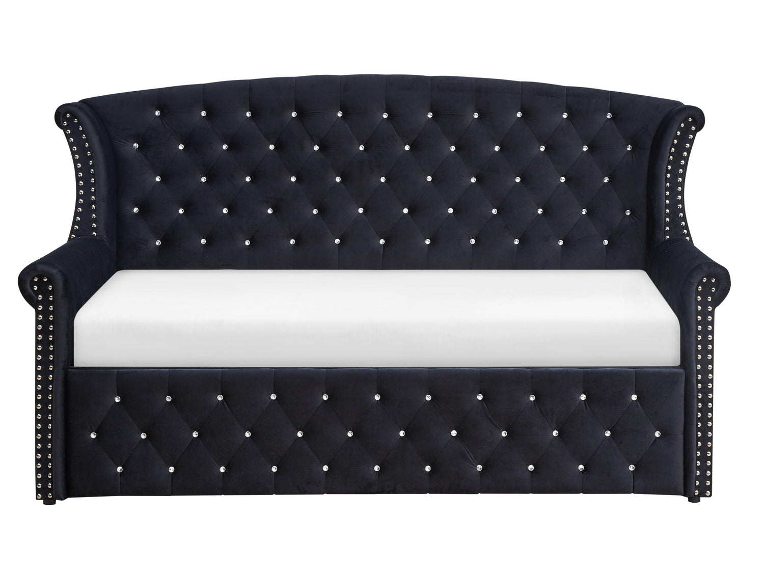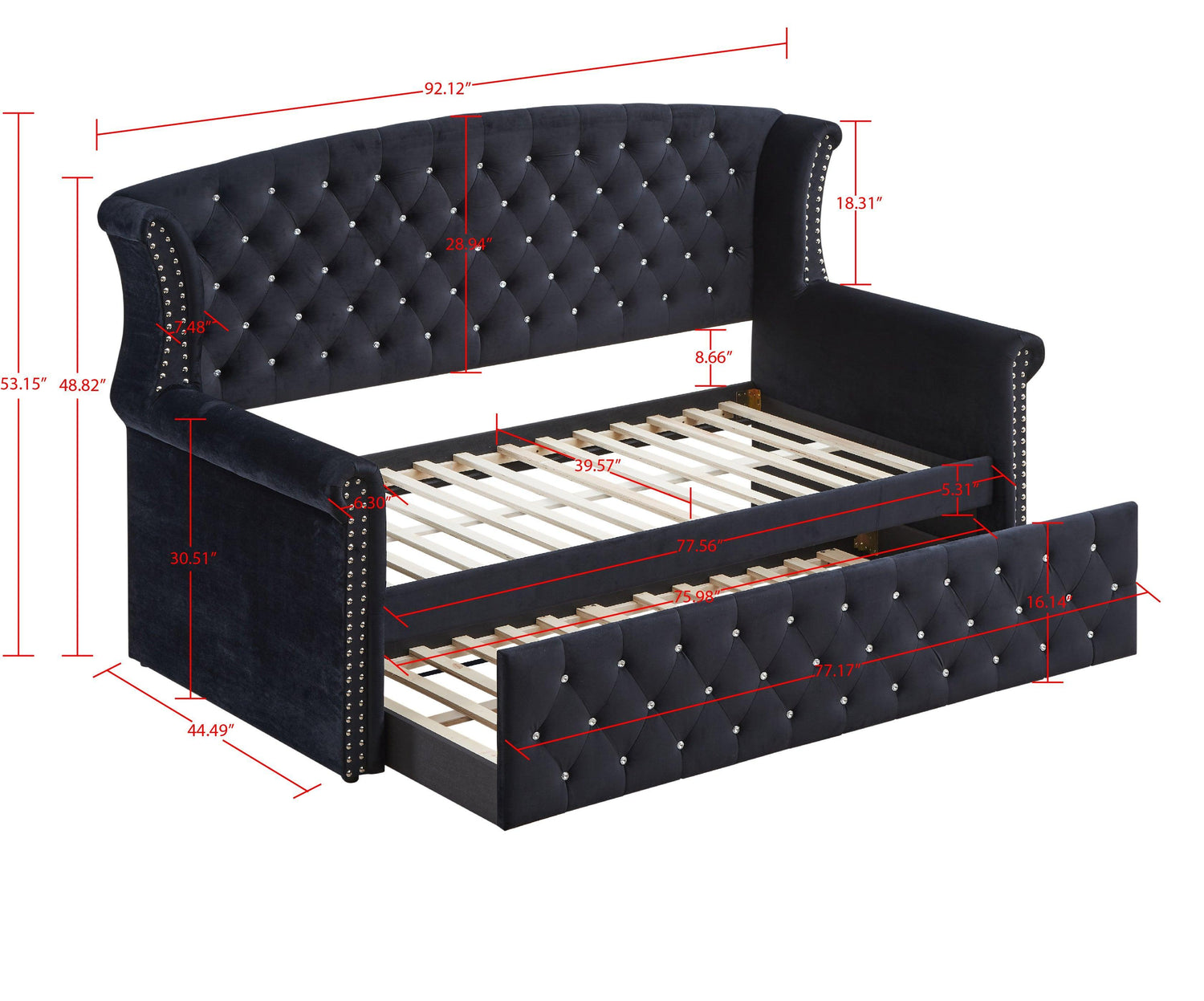The Lucinda Black Velvet Twin Daybed is a beautiful and comfortable piece of furniture. It features a classic design with luxurious velvet upholstery, making it an eye-catching addition to any room. The daybed is also highly functional, with a slatted base that provides support and a pull-out trundle for extra sleeping space. Its sturdy construction and stylish design make it perfect for any home. The Lucinda Black Velvet Twin Daybed is an excellent choice for those who are looking for a comfortable and stylish bed. Its soft velvet upholstery and elegant lines make it a timeless piece that will never go out of style. The daybed's versatility and functionality make it a great choice for any space. It is perfect for a bedroom, guest room, office, or living room. The Lucinda Black Velvet Twin Daybed is a great investment for anyone looking for a comfortable and stylish bed.