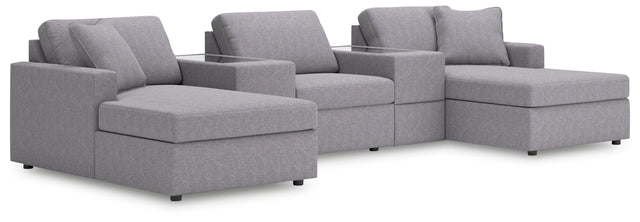 Includes 5 modular pieces: left-arm facing corner chaise, armless chair, 2 consoles with storage and right-arm facing corner chaise