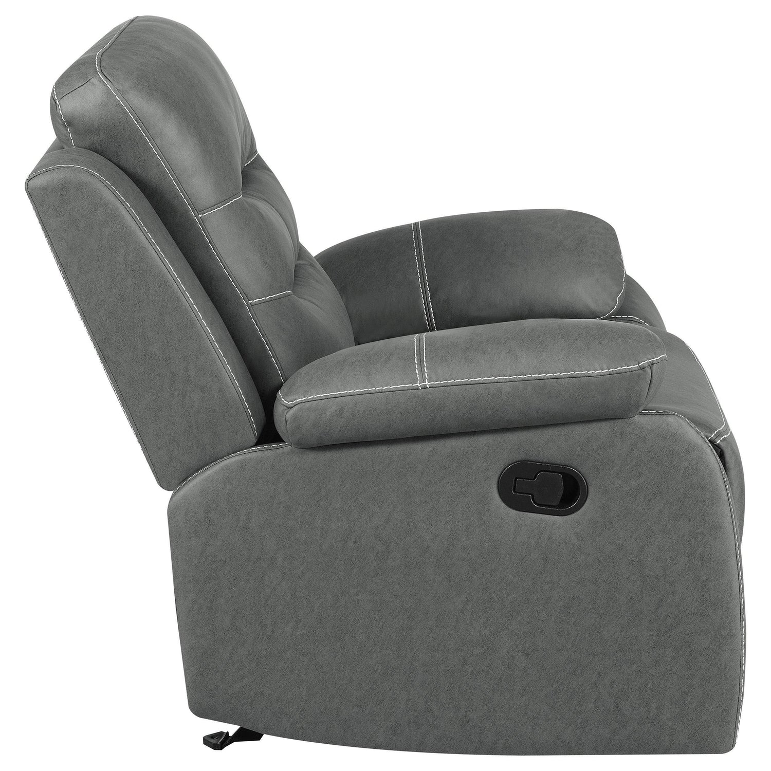 Ultra-cozy in both style and seating experience, the three-piece sofa set is ideal for entertaining or solo and family relaxation. This set includes a reclining sofa and loveseat and a glider recliner, all offering pillowy polyester fiber padding in all the right places. supporting seating comfort and a design boost through tufting and layering. Cool dark grey microfiber upholstery is pleasing and contemporary in a wood-framed set with pocket coil seating. Manual reclining creates customized positions for everything from socializing to napping, as the recliner also adds a glider function, and a wall-hugger design saves space.