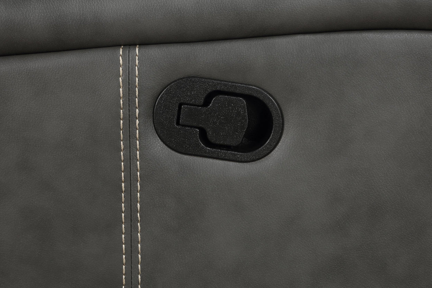 Merging the classic style of both contemporary and transitional design schemes, the two-piece sofa and loveseat set creates a dreamy venue for relaxing. The trending look of smooth grey leatherette upholstery with vertical topstitching delivers decorative elements and a dimensional impact. This motion-reclining set features foam padding on its frames and pocket coil spring seat cushions, as attached back cushions are capped with ultra-plump headrests. Recline into varying positions using a manual control function, and enjoy space efficiency with its wall-hugger design. Bonus features include a center-mounted loveseat console with a flip-top storage bin and a pair of handy beverage holders.
