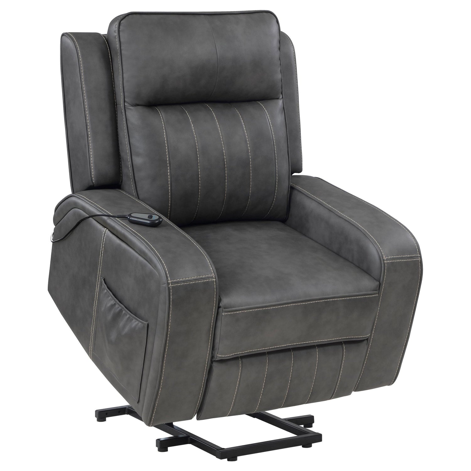 Rich gray and vertical contrasting stitching create a tailored look and feel for a modern power lift recliner. It pairs plush foam cushions with faux leather upholstery, creating a recliner that's both polished and exceptionally inviting. Wide track arms establish it's clean-lined silhouette, while a side pocket adds a place for the remote control or a book. The recliner is power operated with the included remote control, and includes lift functionality that helps one to their feet when needed. It's an ideal solution for multi-generational homes or those with mobility challenges.