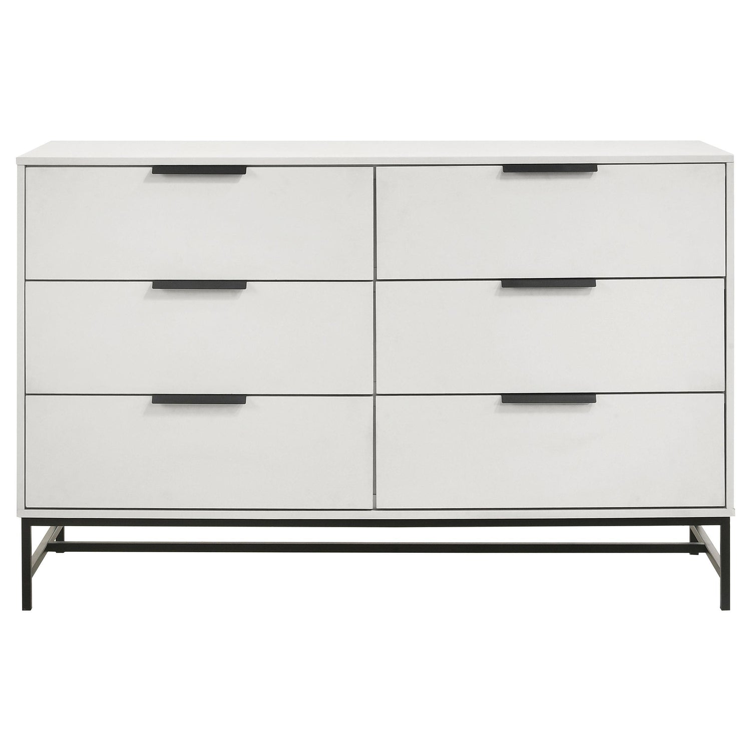 Fresh white brings bright, contemporary appeal to a modern six-drawer dresser. Perfect for a refined or casual bedroom space, it features a melamine finish that's durable and resistant to damage, great everywhere from master suite to a kid's bedroom. Each drawer features a long black finish bar pull that adds contrast. A matching black metal base elevates the dresser and creates an airy finishing touch. Use the top for decor that adds a personal touch to your bedroom.