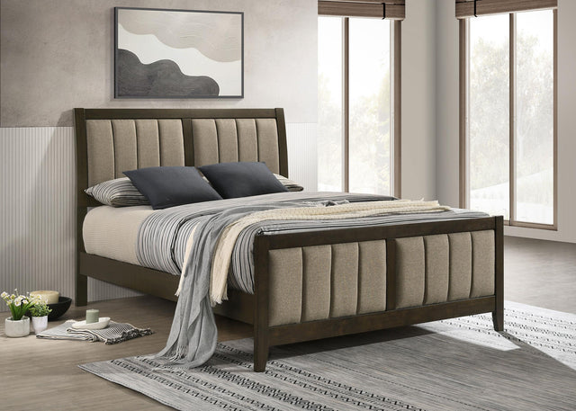 This panel bed adds a luxurious touch to your bedroom with its bold vertical channel tufting on the padded headboard and footboard. The dark cocoa finish complements the soft brown fabric upholstery, creating a warm, inviting aesthetic. The clean lines and vertical detailing provide a sleek, contemporary look while maintaining an air of sophistication. Crafted from high-quality materials, this bed offers both durability and style, making it the perfect centerpiece for your bedroom. Its sturdy design ensures comfort and long-lasting appeal.