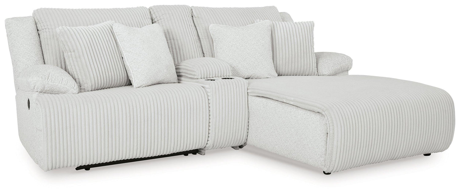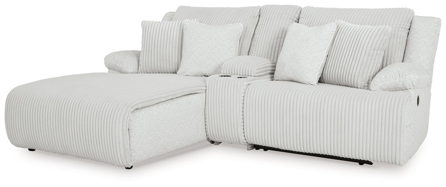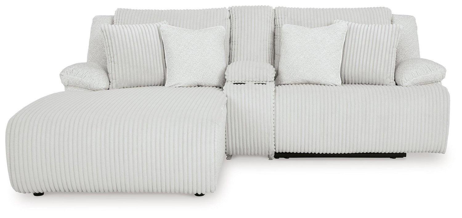 Includes 3 pieces: left-arm facing press back chaise, console with storage and right-arm facing recliner