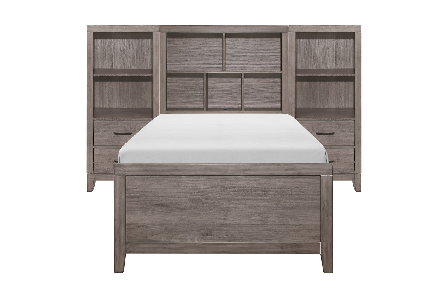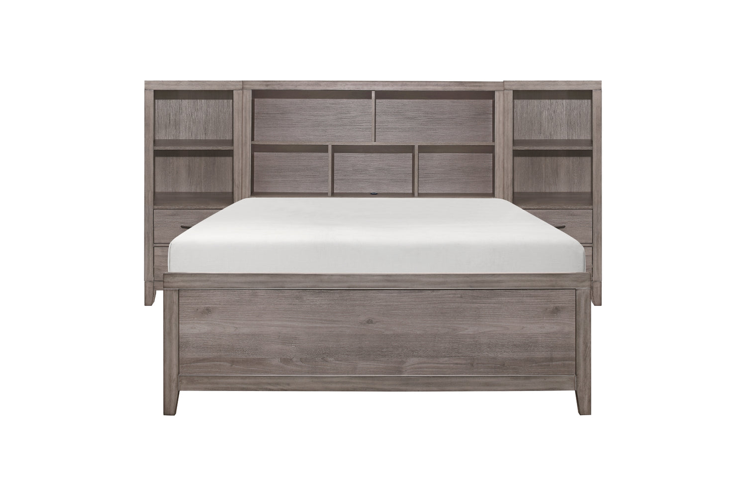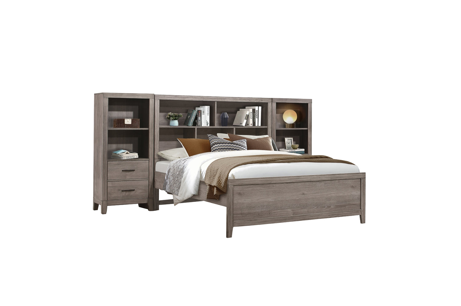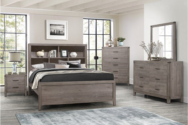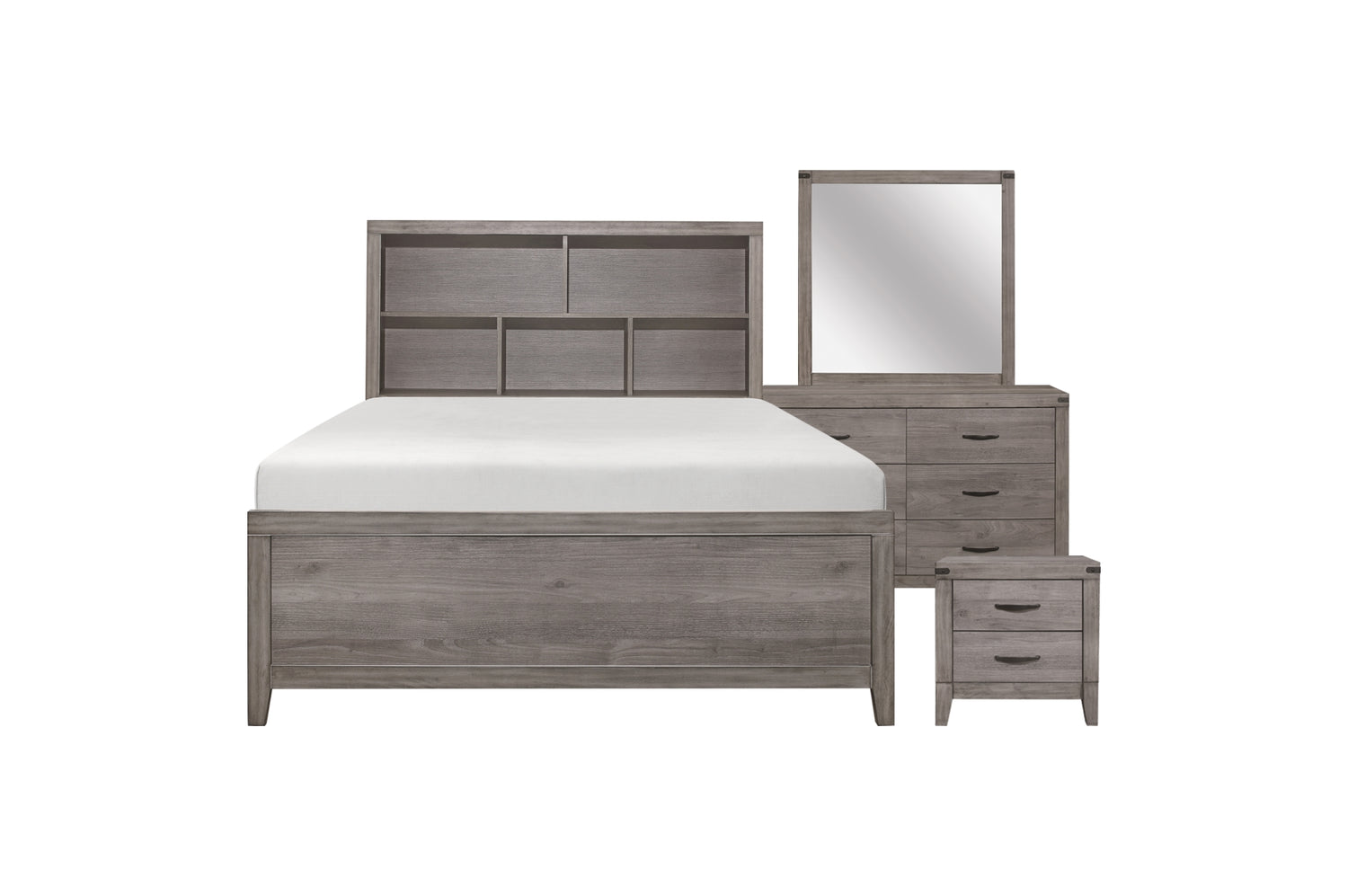 Woodrow Gray Bookcase Platform Bedroom Set - Queen / 3: Bed, Dresser, Mirror is backordered and will ship as soon as it is back in stock.