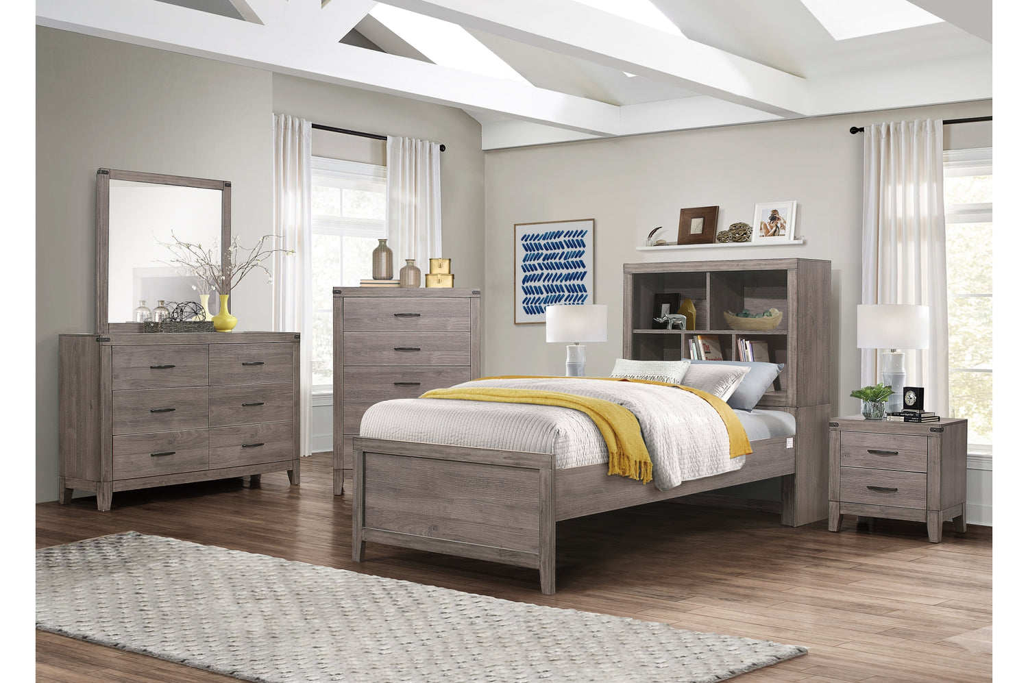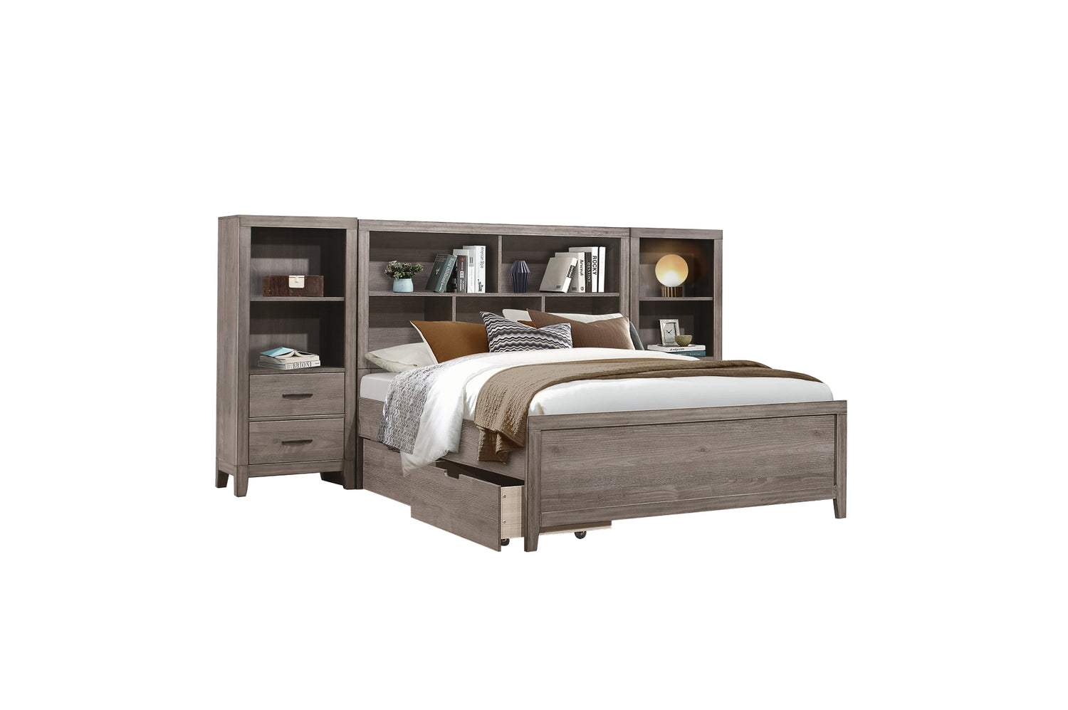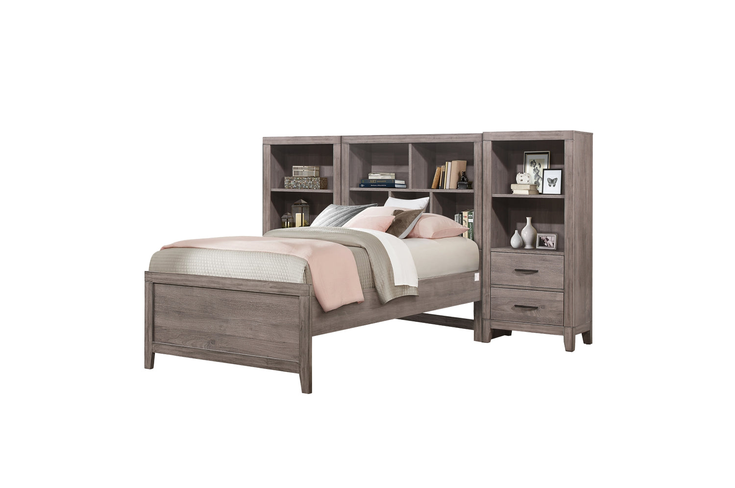 Woodrow Gray Bookcase Platform Bedroom Set - Queen / 3: Bed, Dresser, Mirror is backordered and will ship as soon as it is back in stock.